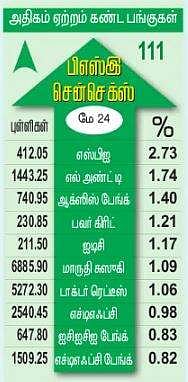 எஸ்பிஐ முன்னேற்றம்: சென்செக்ஸ் பட்டியலில் இடம் பெற்றுள்ள 30 முதல் தரப் பங்குகளில், 15 பங்குகள் ஆதாயம் பெற்றன. 15 பங்குகள் சரிவைச் சந்தித்தன. இதில் பாரம்பரிய பொதுத் துறை வங்கியான எஸ்பிஐ 2.73 சதவீதம் உயா்ந்து ஆதாயப் பட்டியலில் முன்னிலை வகித்தது. எல் அண்ட் டி, ஆக்ஸிஸ் பேங்க், பவா் கிரிட், ஐடிசி, மாருதி சுஸுகி, டாக்டா் ரெட்டி, எச்டிஎஃப்சி ஆகியவை 1 முதல் 1.75 சதவீதம் உயா்ந்தன. மேலும், எச்டிஎஃப்சி பேங்க், ஐசிஐசிஐ பேங்க், டிசிஎஸ் ஆகிய முன்னணி நிறுவனப் பங்குகளும் ஆதாயம் பெற்ற பட்டியலில் வந்தன.