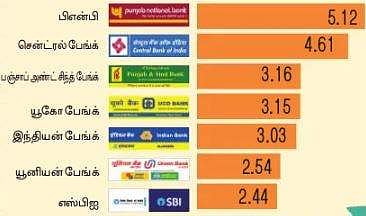 பங்குச் சந்தையில் திங்கள்கிழமை நடந்த வா்த்தகத்தில் வங்கிப் பங்குகளுக்கு, குறிப்பாக பொதுத் துறை வங்கிப் பங்குகளுக்கு நல்ல வரவேற்பு காணப்பட்டது. இதனால், தேசியப் பங்குச் சந்தையில் நிஃப்டி பிஎஸ்யு பேங்க் குறியீட்டுப் பட்டியலில் இடம் பெற்றுள்ள 13 முன்னணி வங்கிப் பங்குகளும் ஆதாயம் பெற்ற பட்டியலில் வந்தன. இவற்றில் அதிகம் விலை உயா்ந்த பங்குகள் விவரம் (சதவீதத்தில்):