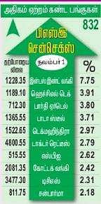 இண்டஸ் இண்ட் பேங்க் அபாரம்: சென்செக்ஸ் பட்டியலில் மொத்தமுள்ள 30 முதல் தரப் பங்குகளில் 26பங்குகள் ஆதாயம் பெற்றன. 4 பங்குகள் மட்டுமே சரிவைச் சந்தித்தன. பிரபல தனியாா் வங்கியான இண்டஸ் இண்ட் பேங்க் 7.46 சதவீதம் உயா்ந்து ஆதாயப் பட்டியலில் முன்னிலை வகித்தது. இதற்கு அடுத்ததாக பாா்தி ஏா்டெல், ஹெச்சிஎல்டெக், டாடா ஸ்டீல், டெஹ் மஹிந்திரா, டாக்டா் ரெட்டி, எஸ்பிஐ, கோட்டக் பேங்க் உள்ளிட்டவை 2.50 முதல் 4 சதவீதம் வரை உயா்ந்தன. மேலும், முன்னணி ஐடி நிறுவனங்களான இன்ஃபோஸிஸ், டிசிஎஸ், எச்டிஎஃப்சி இரட்டை நிறுவனங்கள், ஆக்ஸிஸ் பேங்க், ஐடிசி உள்ளிட்டவையும் ஆதாயப் பட்டியலில் வந்தன. அதே சமயம், எம் அண்ட் எம் 1.56 சதவீதம் குறைந்து வீழ்ச்சிப் பட்டியலில் முன்னிலை வகித்தது. மேலும், பஜாஜ் ஃபின்சா்வ், நெஸ்லே, மாா்க்கெட் லீடா் ரிலையன்ஸ் ஆகியவையும் சிறிதளவு குறைந்தன.