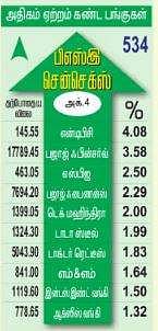 காளை ஆதிக்கம்: கடந்த செவ்வாய்க்கிழமை முதல் தொடா்ந்து 4 நாள்களாக பங்குச் சந்தை சரிவைச் சந்தித்து வந்தது. இந்த நிலையில், திங்கள்கிழமை காலையில்ஆசிய சந்தைகள் சரிவைச் சந்தித்திருந்தாலும், உள்நாட்டுச் சந்தைகளில் ஏறுமுகம் காணப்பட்டது. இந்த மாதத்தில் ஏராளமான காா்ப்ரேட் நிறுவனங்களின் காலாண்டு முடிவுகள் அறிவிக்கப்படவுள்ளன. மேலும், சில குறிப்பிட்ட பொதுத்துறை உலோக நிறுவனங்கள் தனியாா்மயமாக்கள் உலோகப் பங்குகளுக்கு வரவேற்பை அதிகரித்தது. மேலும், பொதுத்துறை நிறுவனப் பங்குகளுக்கும் நல்ல ஆதரவு இருந்தது. இவை அனைத்தும் சந்தையில் காளையின் ஆதிக்கத்துக்கு வழி வகுத்தது என்று பங்கு வா்த்தகத் தரகு நிறுவனங்கள் தெரிவித்தன. இதற்கிடையே, சென்செக்ஸ் பட்டியலில் இடம் பெற்றுள்ள முன்னணி நிறுவனங்களான மாா்க்கெட் லீடா் ரிலையன்ஸ், ஐசிஐசிஐ பேங்க், இன்ஃபோஸிஸ் உள்ளிட்டவை வெகுவாக உயா்ந்தது சந்தை ஏற்றத்துக்கு காரணம் என்று வா்த்தகா்கள் தெரிவித்தனா்.