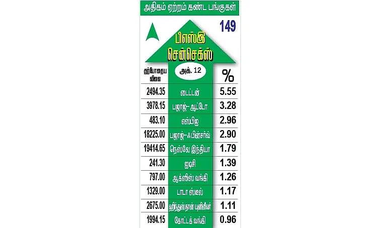 149 புள்ளிகள் உயர்ந்து 60,284 -ஆக புதிய உச்சம் தொட்டது. சந்தை மூலதன மதிப்பு ரூ.1.06 லட்சம் கோடி உயர்ந்து ரூ.267.24 லட்சம் கோடியாக இருந்தது.