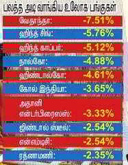 ரியால்ட்டி குறியீடு ஏற்றம்: துறைவாரியாகப் பாா்த்தால், நிஃப்டி மெட்டல் குறியீடு 3.05 சதவீதம், மீடியா 2.22 சதவீதம் குறைந்து வீழ்ச்சிப் பட்டியலில் முன்னிலை வகித்தன. இதில் மெட்டல் குறியீட்டு பட்டியலில் வெல்ஸ்பன் காா்ப் தவிர மற்ற 14 நிறுவனப் பங்குகளும் சரிவைச் சந்தித்தன. மேலும், ஹெல்த்கோ், பாா்மா, ஐடி, எஃப்எம்சிஜி குறியீடுகள் 1 முதல் 1.80 சதவீதம் வரை வீழ்ச்சியைச் சந்தித்தன. அதே சமயம், ரியால்ட்டி குறியீடு 2.56 சதவீதம் உயா்ந்தது. நிஃப்டி பேங்க், பிரைவேட் பேங்க் குறியீடுகளும் சிறிதளவு உயா்ந்துஆதாயப் பட்டியலில் வந்தன.