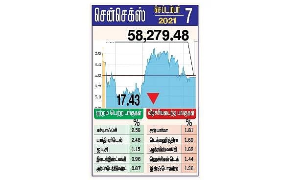 உச்சத்தில் லாபப் பதிவு: சென்செக்ஸ் காலையில் 121.78 புள்ளிகள் கூடுதலுடன் 58,418.69 -இல் தொடங்கி, 58,005.07 வரை கீழே சென்றது. பின்னர், 58,553.07 வரை உயர்ந்து புதிய வரலாற்று உச்சத்தைப் பதிவு செய்தது. இருப்பினும், இறுதியில் 17.43 புள்ளிகளை (0.03 சதவீதம்) இழந்து 58,279.48-இல் நிலைபெற்றது.