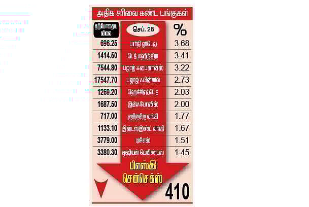பிரபல தனியார் தொலைத் தொடர்பு நிறுவனமான பார்தி ஏர்டெல் 3.68 சதவீதம் மற்றும் டெக் மஹிந்திரா 3.41 சதவீதம், பஜாஜ் ஃபைனான்ஸ் 3.22 சதவீதம் குறைந்து வீழ்ச்சிப் பட்டியலில் முன்னிலை வகித்தன. இதற்கு அடுத்ததாக பஜாஜ் ஃபின்சர்வ், ஹெச்சிஎல் டெக், இன்ஃபோஸிஸ், ஐசிஐசிஐ பேங்க், இன்டஸ்இண்ட் பேங்க், டிசிஎஸ், ஏஷியன் பெயிண்ட்ஸ், எச்டிஎஃப்சி, ஆக்ஸிஸ் பேங்க் உள்ளிட்டவையும் 1 முதல் 2.75 சதவீதம் வரை சரிவைச் சந்தித்தன. மேலும், எஸ்பிஐ, எச்டிஎஃப்சி பேங்க், ஐடிசி உள்ளிட்டவையும் சரிவைச் சந்தித்த பட்டியலில் வந்தன.