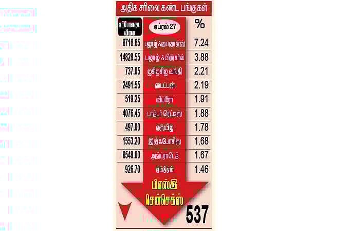 இதில், பஜாஜ் ஃபைனான்ஸ் 7.77 சதவீதம், பஜாஜ் ஃபின்சர்வ் 3.88 சதவீதம் குறைந்து வீழ்ச்சிப் பட்டியலில் முன்னிலை வகித்தன. இவற்றுக்கு அடுத்ததாக, ஐசிஐசிஐ பேங்க், டைட்டன், விப்ரோ, டாக்டர் ரெட்டீஸ் லேப்,