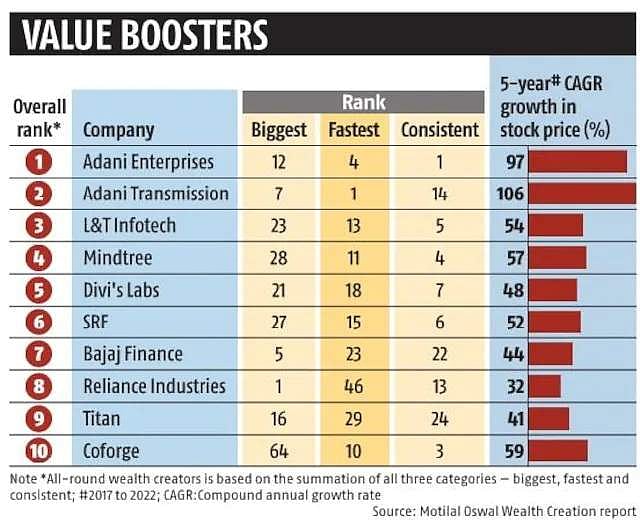 அந்தவகையில் 2017 - 2022 வரையிலான 5 ஆண்டில் அதிக அளவில் செல்வங்களை சேர்த்தவர்களின் பட்டியலில், முகேஷ் அம்பானியின் ரிலையன்ஸ் நிறுவனம் முதலிடம் பிடித்துள்ளது. இந்தியாவில் முதல் 100 பட்டியலிடப்பட்ட நிறுவனங்களால் கடந்த 5 ஆண்டுகளில் உருவாக்கப்பட்ட ரூ.92.2 லட்சம் கோடி சொத்துக்களில் ரூ.13.02 லட்சம் கோடி அம்பானியுடையது.
