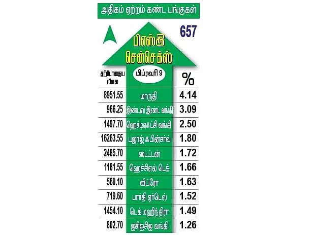 ஆட்டோ, மெட்டல், பேங்க் குறியீடுகள் முன்னேற்றம்: தேசிய பங்குச் சந்தையில் நிஃப்டி பிஎஸ்யு பேங்க், ஆயில் அண்ட் காஸ் குறியீடுகள் தவிர மற்ற அனைத்துத் துறை குறியீடுகளும் ஆதாயப் பட்டியலில் வந்தன. இதில் நிஃப்டி ஆட்டோ குறியீடு 2.20 சதவீதம் உயர்ந்து பட்டியலில் முன்னிலை வகித்தது. இதற்கு அடுத்ததாக, நிஃப்டி பேங்க், மீடியா, மெட்டல், பிரைவேட் பேங்க், கன்ஸ்யூமர் டியூரபல்ஸ் குறியீடுகள் 1.50 முதல் 1.80 சதவீதம் வரை ஏற்றம் பெற்றன.