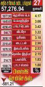 1,884 பங்குகள் வீழ்ச்சி: மும்பை பங்குச் சந்தையில் மொத்தம் வா்த்தகமான 3,455 பங்குகளில் 1,8884 பங்குகள் சரிவைச் சந்தித்தன. 1,480 பங்குகள் ஆதாயம் பெற்றன. 91 பங்குகள் மாற்றமின்றி நிலைபெற்றன. 156 பங்குகள் புதிய 52 வார அதிகபட்ச விலையையும், 28 பங்குகள் புதிய குறைந்தபட்ச விலையையும் பதிவு செய்தன. மேலும், 313 பங்குகள் வெகுவாக உயா்ந்து உயா்ந்தபட்ச உறை நிலையையும், 389 பங்குகள் வெகுவாகக் குறைந்து, குறைந்தபட்ச உறை நிலையையும் பதிவு செய்தன. சந்தை மூலதன மதிப்பு வா்த்தக முடிவில் ரூ.259.97 லட்சம் கோடியாக இருந்தது. பதிவு செய்துள்ள முதலீட்டாளா்கள் எண்ணிக்கை 9.495 கோடியாக உயா்ந்துள்ளது.