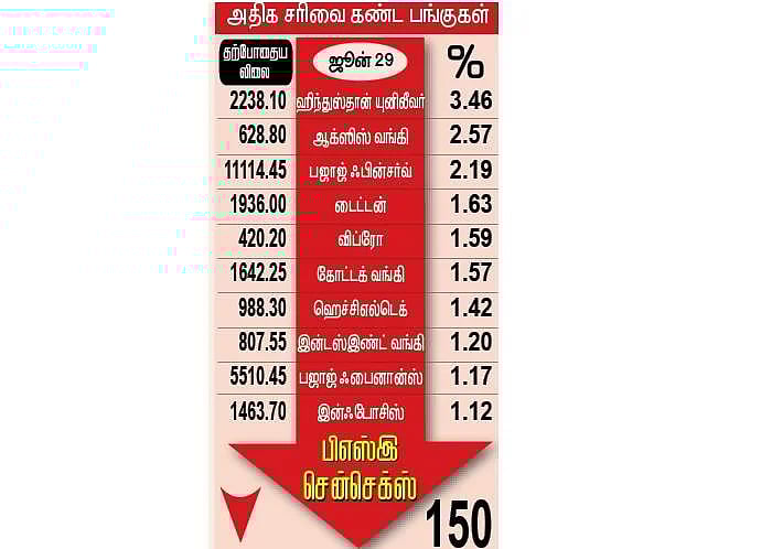 ஹிந்துஸ்தான் யுனிலீவர் கடும் சரிவு: சென்செக்ஸ் பட்டியலில் மொத்தமுள்ள 30 முதல் தரப் பங்குகளில் 10 பங்குகள் மட்டுமே விலையுயர்ந்த பட்டியலில் இருந்தன. 20 பங்குகள் விலை குறைந்த பட்டியலில் வந்தன. இதில் பிரபல நுகர்பொருள் உற்பத்தி நிறுவனமான ஹிந்துஸ்தான் யுனிலீவர் 3.46 சதவீதம் குறைந்து வீழ்ச்சிப் பட்டியலில் முன்னிலை வகித்தது. இதற்கு அடுத்ததாக, ஆக்ஸிஸ் பேங்க் 2.57 சதவீதம், பஜாஜ் ஃபின் சர்வ் 2.19 சதவீதம் குறைந்தன. மேலும், டைட்டன், விப்ரோ, கோட்டக் பேங்க், ஹெச்சிஎல் டெக், இன்டஸ்இண்ட் பேங்க், பஜாஜ் ஃபைனான்ஸ், இன்ஃபோசிஸ், ஏஷியன் பெயிண்ட், எஸ்பிஐ, ஐசிஐசிஐ பேங்க் உள்ளிட்ட முன்னணி நிறுவனப் பங்குகளும் 1 முதல் 1.60 சதவீதம் வரை சரிவைக் கண்டன.