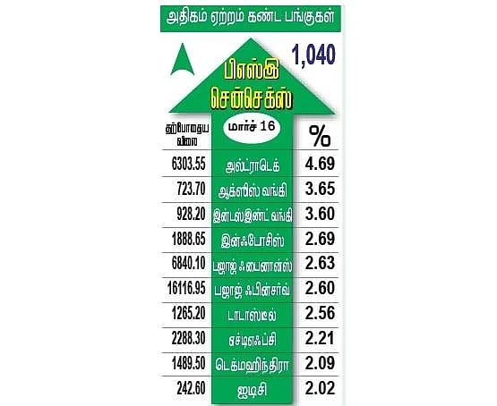 1,040 புள்ளிகள் ஏற்றம்: 5 நாள்களாக தொடர்ந்து ஏற்றம் பெற்றிருந்த சென்செக்ஸ், செவ்வாய்க்கிழமை சரிவைச் சந்தித்தது. இந்த நிலையில், புதன்கிழமை காலையில் சென்செக்ஸ் 778.48 புள்ளிகள் கூடுதலுடன் 55,555.33-இல் தொடங்கி, 56,389.26 வரை கீழே சென்றது. பின்னர், அதிகபட்சமாக 56,605.89 வரை மேலே சென்ற சென்செக்ஸ், இறுதியில் 1,039.80 புள்ளிகள் (1.86 சதவீதம்) உயர்ந்து 56,816.65-இல் நிலைபெற்றது. பெரும்பாலான நேரம் சந்தை காளையின் ஆதிக்கத்தில் இருந்தது.