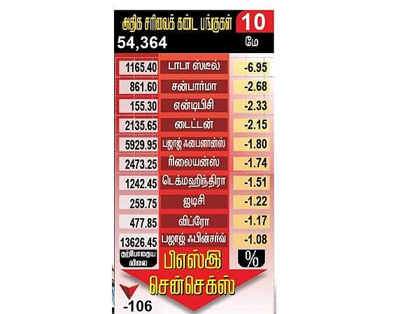 டாடா ஸ்டீல்: சென்செக்ஸ் பட்டியலில் அடங்கியுள்ள, டாடா ஸ்டீல் பங்கின் விலை அதிகபட்சமாக 6.95 சதவீதம் வீழ்ச்சி கண்டது. அதைத் தொடா்ந்து, சன் பாா்மா, என்டிபிசி, டைட்டன், பஜாஜ் ஃபைனான்ஸ், ரிலையன்ஸ் இண்டஸ்ட்ரீஸ், டெக் மஹிந்திரா, ஐடிசி பங்குகளும் குறைந்த விலைக்கு கைமாறின.
