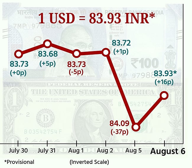 அமெரிக்க டாலருக்கு நிகரான இந்திய ரூபாய் மதிப்பு இன்று (ஆக. 6) சற்று உயர்ந்தது.