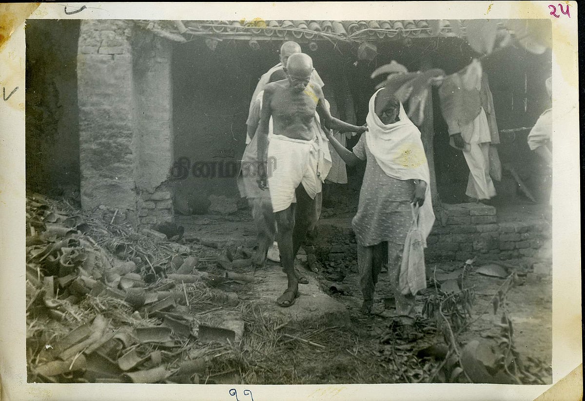 நவகாளி யாத்திரை மேற்கொள்கையில் ஃப்ரண்டியர் காந்தி என்று அழைக்கப்பட்ட கான் அப்துல் கபார் கானுடன் வன்முறைகளைக் காண வருத்தத்துடன் புறப்படும் காந்தி...