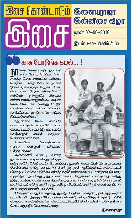 அன்னக்கிளி வாய்ப்பு வந்தது. இசையமைப்பாளராக வெற்றிபெற்றாயிற்று. அடுத்தடுத்தப் படங்களில் வாய்ப்பு. ஆனால், அம்மாவிடம் விளையாட்டாகச் சொன்னதைச் செய்து பார்த்தால் என்ன? ஒரு நாள் ஆர்மோனியம், தபேலாவுடன் பீச்சுக்குப் போனோம். பீச்சில் வாசிக்கிற மாதிரி வரிசையாகப் படம் எடுத்துக் கொண்டு வருகிறோம். அப்போது அந்தப் பக்கம் 'சிகப்பு ரோஜாக்கள்' படப்பிடிப்பு நடக்கிறது. இந்தப் படத்துக்கு முன்னாடி நான், பாஸ்கர், அமர் மூன்று பேரும் அங்கே இருந்த ப்ளாட்பாரத்தில் உட்கார்ந்து வாசிக்க ஆரம்பித்து விட்டோம். வாசித்துக் கொண்டிருப்பதை கமல் பார்த்து எங்களிடம் வந்தார்.