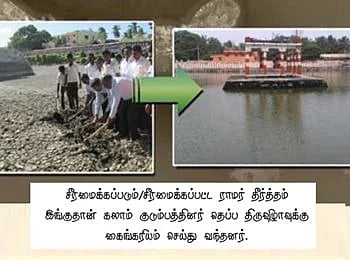 டாக்டர் கலாம், இந்தச் சீரமைப்புப் பணி குறித்து கூறினார்: ‘விவேகானந்த கேந்திர நண்பர்கள், புனித நீர்த் தீர்த்தங்களை சீரமைக்கும் பணியில் ஈடுபட்டுள்ளனர். இன்று அவர்கள், பல பத்தாண்டுகளாக கைவிடப்பட்டு மாசடைந்த தீர்த்தங்களை சீரமைக்கின்றனர். அவர்கள் முட்செடிகளை அகற்றியுள்ளனர். தேங்கி நிற்கும் மாசடைந்த நீரை அகற்றியுள்ளனர். அவர்கள், உடைந்த மது பாட்டில்களையும் உள்ளே எறியப்பட்ட இதர மாசுகளையும் அகற்றியுள்ளனர். இப்போது யாத்ரீகர்கள் இந்த தீர்த்தங்களுக்கு சென்று புனித நீராடலாம். விவேகானந்த கேந்திரத்தினரின் இந்தப் பணி பாராட்டுதலுக்கு உரியது. அவர்கள் ஒவ்வொருவரையும் இந்த உயர்ந்த செயலுக்காக நான் பாராட்டுகிறேன்’.