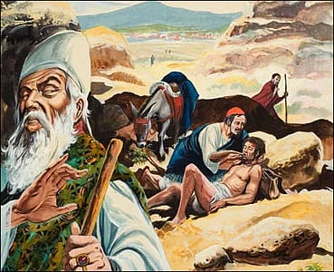 தனிப்பாதை ஒன்றில் கள்வர்களால் தாக்கப்பட்டு விழுந்துகிடக்கும் மனிதன். அவனைத் தாண்டிச் செல்கின்றனர் பலர். ஒரு மத குரு அவனைக் கண்டும் காணாமல் செல்கிறார். அங்கு வந்த உயர் குலத்தோரும் அவனைக் கண்டுகொள்ளவில்லை. இறுதியாக, சமாரியன் அங்கே வருகிறான். அவனைக் கண்டு அவனைத் தூக்கி நீர் அளிக்கிறான். காயங்களுக்கு மருந்து போடுகிறான். இப்போது கேள்வி கேட்ட சட்ட வல்லுனரிடம், கதை சொன்னவர் கேட்கிறார் - ‘காயம்பட்டுக் கிடந்தவனின் அணுக்கத்தவன் யார்?’ அந்தச் சமாரியனே என்கிறார் அந்தச் சட்ட வல்லுனர். (லூக்கா 10:31-7).