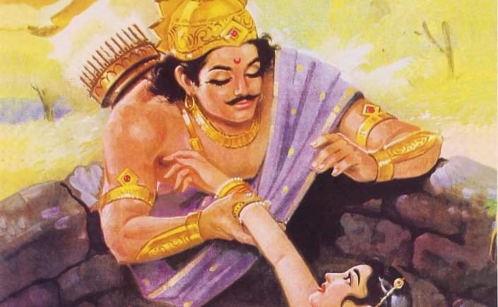 ‘அதைப்பற்றி நீ கவலைப்படத் தேவையில்லை பெண்ணே. நான் கற்ற 'தனுர் வேதம்' நீ அறிந்திருக்க வாய்ப்பில்லை’ என்றவன் வில்லில் நாணேற்றி சரமாரியாக தொடுத்து அம்பினால் ஒரு தாமரை போன்ற கூடை செய்து, அதை கொடிகளில் கட்டி கீழே இறக்கினான். அதில் ஏறிக் கொண்டாள் தேவயானி. மெல்ல அக்கூடையை கிணற்றிலிருந்து மேலே தூக்கினான். அவள் வலக்கையை பிடித்து அம்புக் கூடையில் இருந்து வெளியே இறக்கி விட்டான். வெளியே வந்த தேவயானி தான் கிணற்றினுள் விழுந்த கதையை அவனிடம் சொல்லி முடித்து அவளை காப்பாற்றியதற்கு நன்றி கூறி விடை பெற்றாள்.
