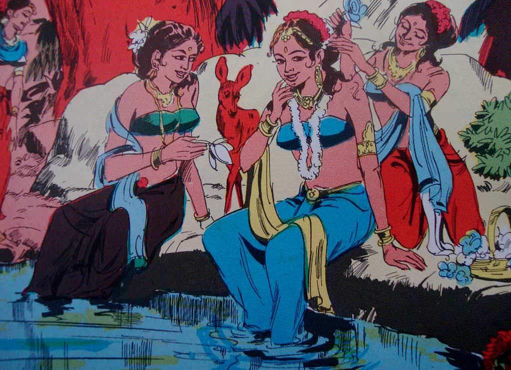 அசுரச் சக்ரவர்த்தி விருஷபர்வாவின் மகள் சர்மிஷ்டை, அசுர குரு சுக்ராச்சார்யாரின் மகள் தேவயானி மற்றும் அவர்களது தோழிகள் என கெண்டை மீன்களை ஒத்த கரிய நீண்ட கண்களையும், மாந்தளிர் போன்ற அழகிய மேனியும் உடைய பருவ மங்கைகள் நீராடிக் கொண்டிருந்தனர். கரையில் ஏறியும் அங்கிருந்து நீரில் பாய்ந்து நீந்தியும் மீன்களை துரத்தியும் பிடித்தும் என அவர்களது விளையாட்டு அந்தி சாய்ந்தும் முடிந்தபாடில்லை.