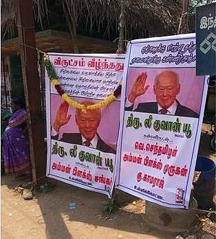 ‘மண் வீட்டில் வாழ்ந்த எங்களை மாடி வீட்டில் வாழவைத்த தெய்வமே’ என்று நன்றியுடன் பதாகையில் தெரிவிக்கிறார்கள், கூப்பாச்சிக்கோட்டை குமார், ராஜராஜன் இருவரும். இன்னொரு பதாகை சொல்கிறது, ‘லீ இமயமலை போன்றவர். ஏராளமான தமிழ்க் குடும்பங்களின் வறுமையை ஒழித்த மாபெரும் தலைவர். அவருக்கு எங்கள் இதயமார்ந்த அஞ்சலி’.