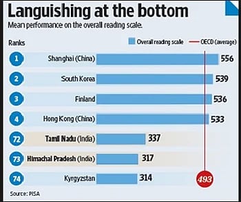 மிக எளிதான இந்தத் தேர்வில் நாம் எழுபத்தி மூன்றாவது இடத்தில் இருக்கிறோம். அதாவது பிசா ஆய்வு செய்த எழுபத்திநான்கு நாடுகளில் உள்ள பள்ளிக் குழந்தைகளின் கல்வித் தரப் பட்டியலில் நாம் எழுபத்திமூன்றாவது இடத்தில் இருக்கிறோம். அதாவது எழுபத்திநான்கிற்கு எழுபத்தி மூன்று.
