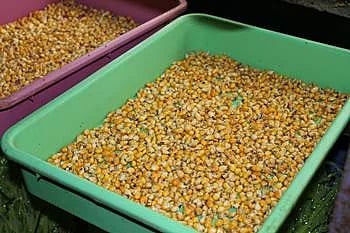பத்து தட்டுகளுக்குத் தேவையான மூன்று கிலோ மக்காச்சோளத்தை நன்கு நீரில் மூழ்கும்படி ஒரு பிளாஸ்டிக் வாளியில் 24 மணி நேரம் ஊறவைக்க வேண்டும். இந்த ஊறிய விதையை சணல் சாக்கில் கட்டி 24 மணி நேரத்துக்கு இருட்டில் வைக்க வேண்டும். 24 மணி நேரம் கழித்துப் பார்த்தால், விதைகளில் சிறு முளை விட்டிருக்கும்.