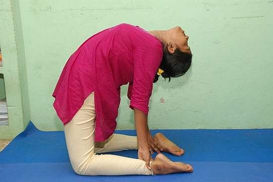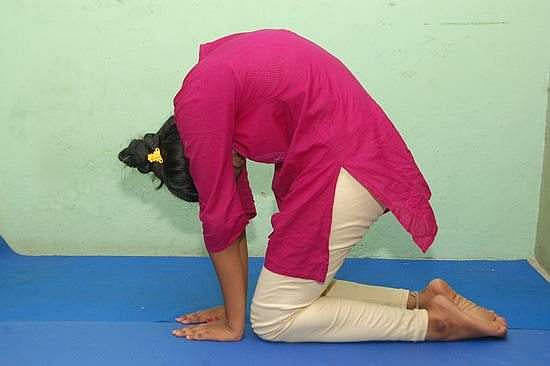 இரண்டு உள்ளங்கைகளையும் முழங்கால்களுக்கு அருகில் வைத்து, முதுகை ஒட்டகம்போல உயர்த்திக்கொண்டு