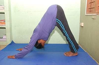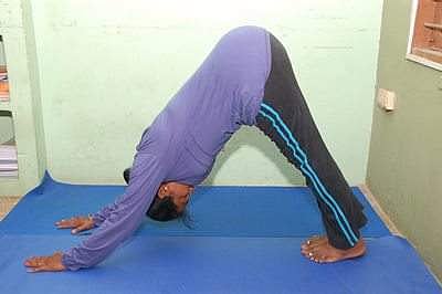 8. பர்வதாசனம் - அப்படியே முதுகை உயரரே தூக்கி, தலையை இரண்டு கைகளுக்கும் நடுவே குனிந்தபடி வைத்து, கால்களை மடக்காமல் விரைப்பாக நிற்கவும்.