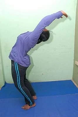 இடது உள்ளங்கை, வலது உள்ளங்கை, இடது பாதம் இம்மூன்றும் ஒரே கோட்டில் இணையாக இருக்க வேண்டும். இதே நிலையில் சுமார் ஆறு சுவாசங்கள் இருக்கவும்.