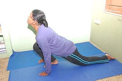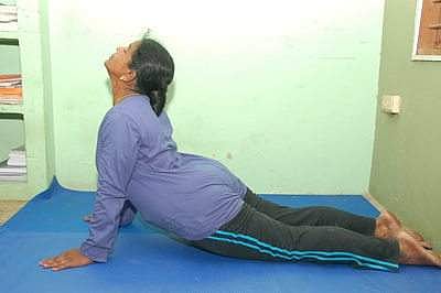 7. ஊர்த்துவமுக புஜங்காசனம் - பிறகு சுவாசத்தை உள்ளிழுத்தவாறு நெஞ்சை உயர்த்தி, முகத்தை ஆகாயத்தைப் பார்க்குமாறு வைக்கவும். அடிவயிறு மற்றும் தொடைகள், முழங்கால்கள் யாவும் விரிப்பின் மீது படிந்திருக்க வேண்டும்.