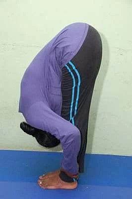 10. பாதஹஸ்தாசனம் - அடுத்தபடியாக பின்னால் இருக்கும் வலது காலையும் முன்னால் கொண்டுவந்து, இடது காலோடு சேர்த்துவைத்து குனிந்து நிற்கவும்.