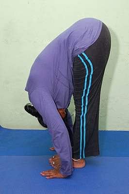 3. பாதஹஸ்தாசனம் - சுவாசத்தை மெள்ள வெளியிட்டவாறு முன்பக்கமாக வளைந்து குனிந்து, கைகளால் கால்கள் இரண்டையும் தொட்டுக்கொண்டு நிற்கவும்.