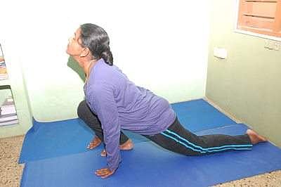 4. அஸ்வசன்சால ஆசனம் - இரண்டு கைகளையும் இரண்டு கால்களுக்கு பக்கவாட்டில் வைக்கவும். வலது காலை மட்டும் முழங்கால் தரையில் படுமாறு பின்பக்கமாக நீட்டி வைக்கவும்.