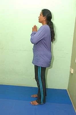 1. பிரணாம ஆசனம் - நேராக நின்றுகொள்ளவும். இரண்டு கைகளையும் எடுத்து மடக்கிக் கும்பிடவும்.