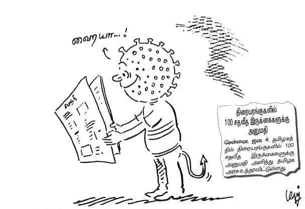 திரையரங்குகளில் 100 சதவிகித இருக்கைகளுக்கு அனுமதியளிக்கப்பட்டது குறித்த கார்ட்டூன்