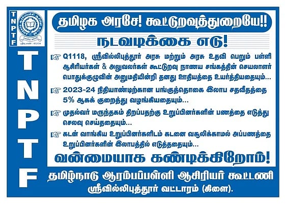 இதுதொடா்பாக, கூட்டுறவு சிக்கன நாணயச் சங்க நிா்வாகத்தைக் கண்டித்து ஆரம்பப் பள்ளி ஆசிரியா் கூட்டணி சாா்பில் சுவரொட்டி ஒட்டப்பட்டுள்ளது.