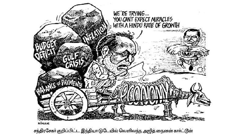""சோ, "இந்தியா டுடே' இதழில் ஒரு கட்டுரை வந்திருக்கிறது, படித்துப் பாருங்கள். அதில் அஜித் நைனான் பிரமாதமாக ஒரு கார்ட்டூன் வரைந்திருக்கிறார். அதுதான் உண்மையான நிலைமை. நான் மந்திரவாதியல்ல சோ. ஆனாலும், கிடைத்த வாய்ப்பைப் பயன்படுத்தி, இந்தியாவைப் பாதுகாத்துவிட வேண்டும் என்று முயற்சிக்கிறோம். ஐந்து வருட ராஜீவ் காந்தி அரசும், 11 மாத வி.பி. சிங்அரசும் இந்தியாவை திவால் நிலைக்குத் தள்ளி இருக்கின்றன. உலக வங்கியிலும், சர்வதேச நிதியத்திடமும் இந்தியாவை அடகு வைத்துவிடாமல் காப்பாற்ற நாங்கள் முயற்சித்து வருகிறோம். ராஜீவ் காந்தி இதையெல்லாம் புரிந்து கொள்ளவில்லை என்றே எனக்குத் தோன்றுகிறது. அவருக்கு நெருக்கமானவர்கள் சர்வதேச சக்திகளின் கைப்பாவையாக இருக்கிறார்கள்.''