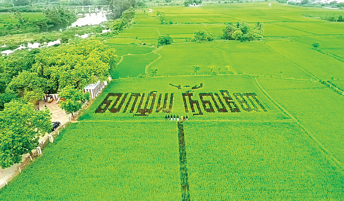 என்னிடம் பாரம்பரிய அரிசி வாங்குவதற்கு வந்திருந்த சேரன்மாதேவி அரசு பெண்கள் உயர்நிலைப்பள்ளி ஓவிய ஆசிரியர் நைனார் வடிவமைப்பு உதவியுடன், கடந்த மூன்று மாத முயற்சியில் தற்போது வயலில் , 'வாழிய நிலனே' என்று புறநானூறு பாடல் சொற்றொடரை வரைந்துள்ளேன்.