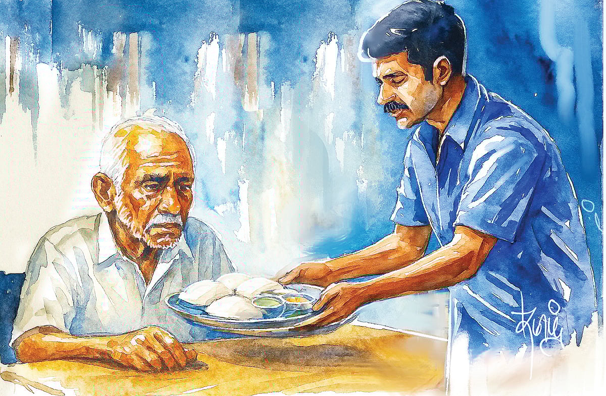 சட்டைப் பையைத் தடவியபடி, 'ஓர் இட்லி எவ்வளவு' என்று கேட்டு விட்டு உள்ளே நுழைந்தார் ஒரு முதியவர். அவரது வறிய முகம் கண்ட ஓட்டல் முதலாளி ராமசாமி பாதி விலையைச் சொன்னார். உள்ளே வரவழைத்து அமர வைத்தார்.