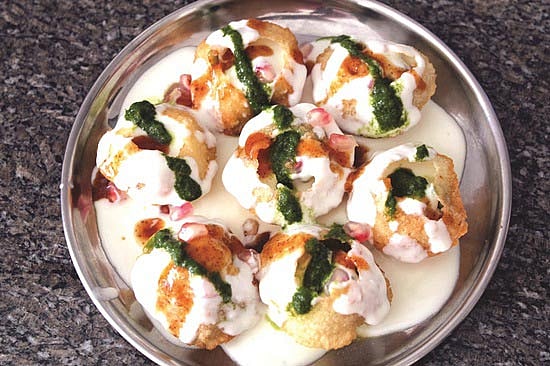 பின்னர் பூரியின் மேல் ஓட்டை போட்டு அதனுள் வேகவைத்து மசித்தப் பாசிப் பயறை போடவும். அடுத்து இனிப்பு சட்னி தூவவும். கடைசியாக கடைந்த தயிர் சேர்த்து, ஓமப்பொடி, காராபூந்தித் தூவி பரிமாறவும்.