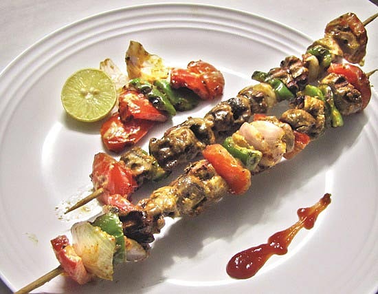 செய்முறை: வெங்காயத் துண்டுகளில் உப்பு, மிளகுத்தூள் சேர்த்து பிரட்டி வைக்கவும். கடாயில் எண்ணெய் விட்டு காய்ந்ததும் பூண்டு, மிளகாய் விழுதை சேர்த்து வதக்கவும்,அத்துடன் உப்பு, சிறிது மிளகுத்தூள் சேர்த்து வதக்கி, அதில் வறுத்த பொடி சேர்த்து கிளறி, அதில் குடை மிளகாய், காளான் சேர்த்து கால் மணி நேரம் ஊற வைக்கவும். பிறகு சூடான எண்ணெயில் வறுத்து எடுத்து ஸ்டிக்கில் குடை மிளகாய் துண்டு, வெங்காயத் துண்டு, காளான் என மாறி மாறி செருகி பரிமாறவும்.