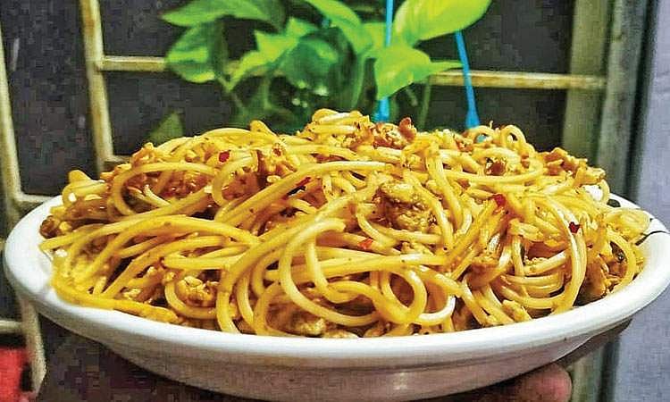 பின்னர், வாணலியில் வெண்ணெய்யை விட்டு அதில் தக்காளி விழுது, கார்லிக் - சில்லி சாஸ்களைப் போட்டு சற்று புரட்டிக் கொண்டு, கரம் மசாலாத் தூள், சிறிது, உப்பு போட்டு புரட்டவும். அதில் நூடுல்ûஸப் போட்டு இரண்டு நிமிடம் புரட்டிய பின், வெங்காயத்தையும் சேர்த்து வதக்கவும் பின்னர், மீதியுள்ள வெண்ணெய்யைச் சேர்த்து புரட்டி முந்திரிப் பொடியைத் தூவிக் கலந்து இறக்கி விடவும். தயிர் பச்சடியுடன் பரிமாறலாம்.