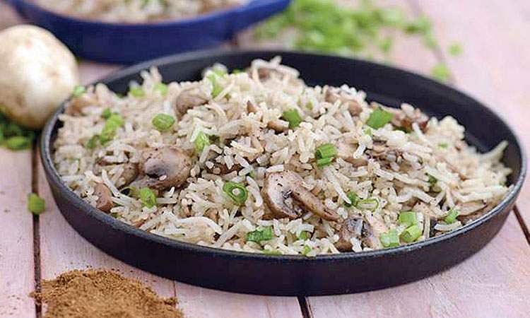 செய்முறை: காளான்களை சிறு துண்டுகளாக நறுக்கி நன்றாகக் கழுவி தண்ணீரை வடிக்கவும். அரிசியை ஒருமணி நேரம் ஊறவைத்து களைந்தெடுத்து, 2 தேக்கரண்டி நெய், சிறிது உப்பு, எலுமிச்சைச் சாறு ஆகியவற்றைச் சேர்த்து 1 பங்கு அரிசிக்கு ஒன்றரை பங்கு தண்ணீர் வைத்து குக்கரில் வடித்து, தட்டில் கொட்டிப் பரப்பி வைக்கவும். வெங்காயத்தை நீள வாக்கில் மெலிதாக நறுக்கிக் கொள்ளவும். தக்காளியை நைஸôக நறுக்கிக் கொள்ளவும். பூண்டை தட்டி வைக்கவும்.