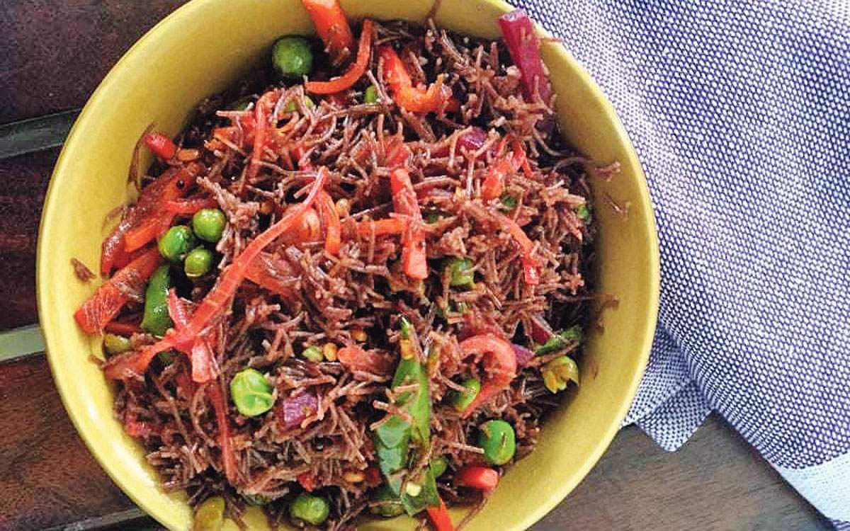 செய்முறை: வாணலியில் நல்லெண்ணெய் விட்டு, காய்ந்ததும் பட்டை, ஏலக்காய், சோம்பு, பூண்டு, பிரிஞ்சி இலை போட்டு வதக்கி, வெங்காயம், பச்சை மிளகாய், தக்காளி, பச்சைப்பட்டாணி, பீன்ஸ், கேரட், புதினா, மஞ்சள்தூள் சேர்த்து மேலும் வதக்கவும். இதில் 2 கப் நீர்விட்டு, பிரியாணி மசாலாத்தூள் சேர்த்து சிறிதளவு நல்லெண்ணெய் விடவும் (இதனால் சேமியா உதிரி உதிரியாக வேகும்) இப்போது ராகி சேமியாவைப் போட்டுக் கிளறி வெந்ததும் கொத்துமல்லித் தழை தூவிப் பரிமாறவும்.