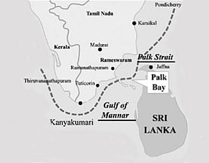 தனுஷ்கோடியிலிருந்து தலைமன்னார் இடையில் சுமார் 30கி.மீ நீளத்திற்கு கற்பாறைகளுடன் கூடிய 13 மணற்திட்டுகள் தாழ்வான தீவுகளைப்போல் அடுத்தடுத்து உள்ளன. இந்த மணல் திட்டுகள்தான் ராமர் சீதையை மீட்க இலங்கைக்குச் சென்றபோது கட்டிய பாலத்தின் மீதமுள்ள பகுதிகள் என்று கூறப்படுகிறது. இது "ஆதாம் பாலம் என்றும் "சேது பாலம்' என்றும் அழைக்கப்படுகிறது. இந்தப் பகுதிகளில் கடலின் ஆழம் மிகவும் குறைவு. அதிகபட்சமே 12 அடிதான்! இந்தப் பாலம்தான் மன்னார் வளைகுடாவையும் பாக் வளைகுடாவையும் பிரிக்கிறது.