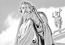 முகப்பின் இருபுறமும் உயர்ந்த தூண்கள் நான்கு வரிசையாக உள்ளன. பலபடிகள் ஏறியே வாயிலை அடைய வேண்டும். படிகளின் இருபுறமும் 18.2அடிகள் உயரமுள்ள புனித பீட்டர், புனித பவுல் சிலைகள் உள்ளன. இந்த முற்றத்தில்தான் கிறிஸ்துமஸ் மற்றும் விழாக்காலங்களில் மக்கள் பிரார்த்தனை செய்ய கூடுவார்கள்.