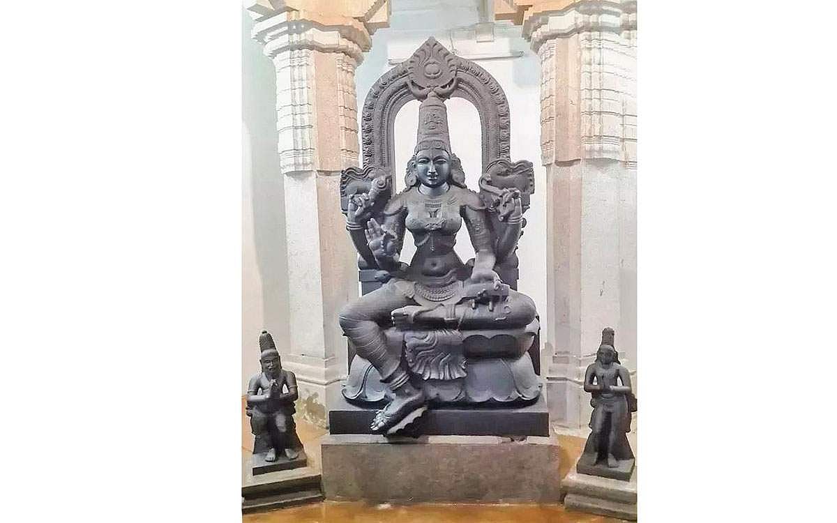கருவறையில் தமிழ்த்தாய் நான்கு கைகளுடன் தாமரை பீடத்தில் அமர்ந்தவாறு காட்சியளிக்கின்றாள்!