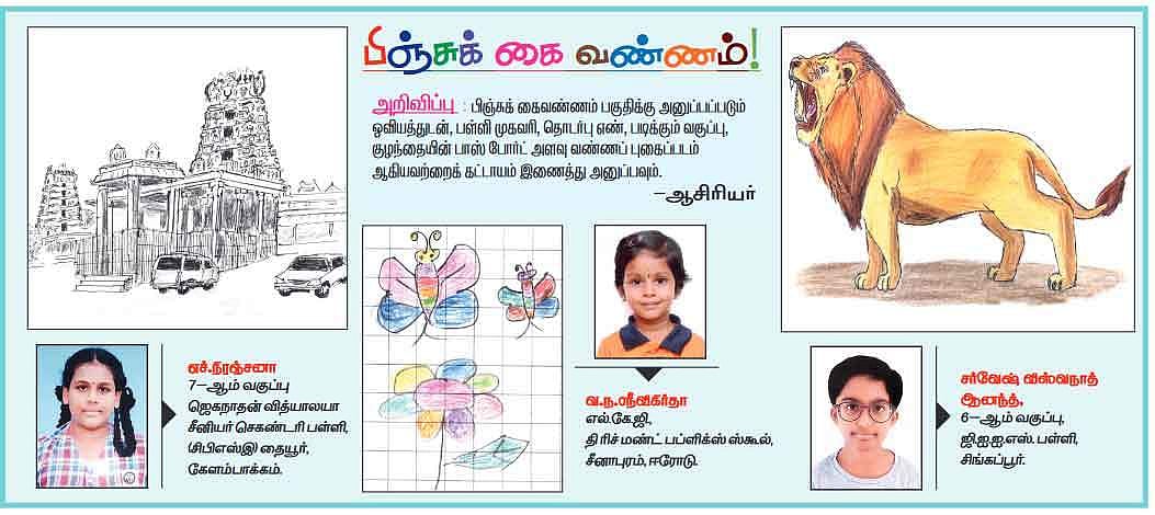 பிஞ்சுக் கைவண்ணம் பகுதிக்கு அனுப்பப்படும் ஓவியத்துடன், பள்ளி முகவரி, படிக்கும் வகுப்பு, குழந்தையின் பாஸ் போர்ட் அளள வண்ணப் புகைப்படம் ஆகியவற்றைக் கட்டாயம் இணைத்து அனுப்பளம்.