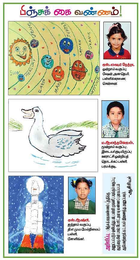 பிஞ்சுக் கைவண்ணம் பகுதிக்கு அனுப்பப்படும் ஓவியத்துடன், பள்ளி முகவரி, படிக்கும் வகுப்பு, குழந்தையின் பாஸ் போர்ட் அளவு வண்ணப் புகைப்படம் ஆகியவற்றைக் கட்டாயம் இணைத்து அனுப்பவும்.