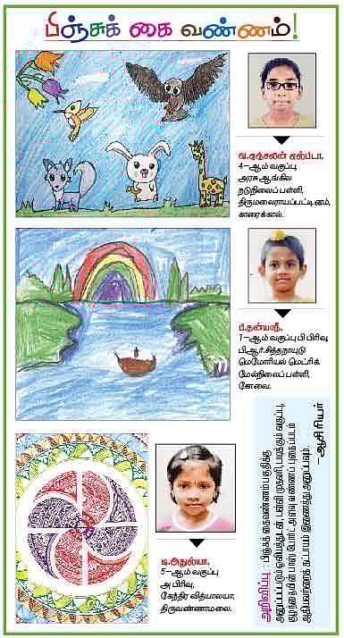 பிஞ்சுக் கைவண்ணம் பகுதிக்கு அனுப்பப்படும் ஓவியத்துடன், பள்ளி முகவரி, படிக்கும் வகுப்பு, குழந்தையின் பாஸ் போர்ட் அளவு வண்ணப் புகைப்படம் ஆகியவற்றைக் கட்டாயம் இணைத்து அனுப்பவும்.