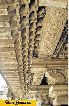 மண்டபத்தில் கொடுங்கை துவங்கும் இடத்தில் கனமாகவும் வர வர முடியும் இடத்தில் ஒரு அங்குல கனமாக சன்னமாக செதுக்கி அமைக்கப்பட்டுள்ளது. மரத்திலே கூட இவ்வளவு சிறப்பாகச் செய்ய முடியுமா என்று எண்ணத் தோன்றும்!